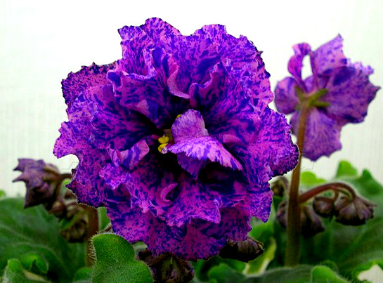 Новинка 2009! Насыщенно розовая махровая волнистая звезда с гофрированной каймой густо обсыпана синим фэнтази. Средне-зеленая волнистая листва